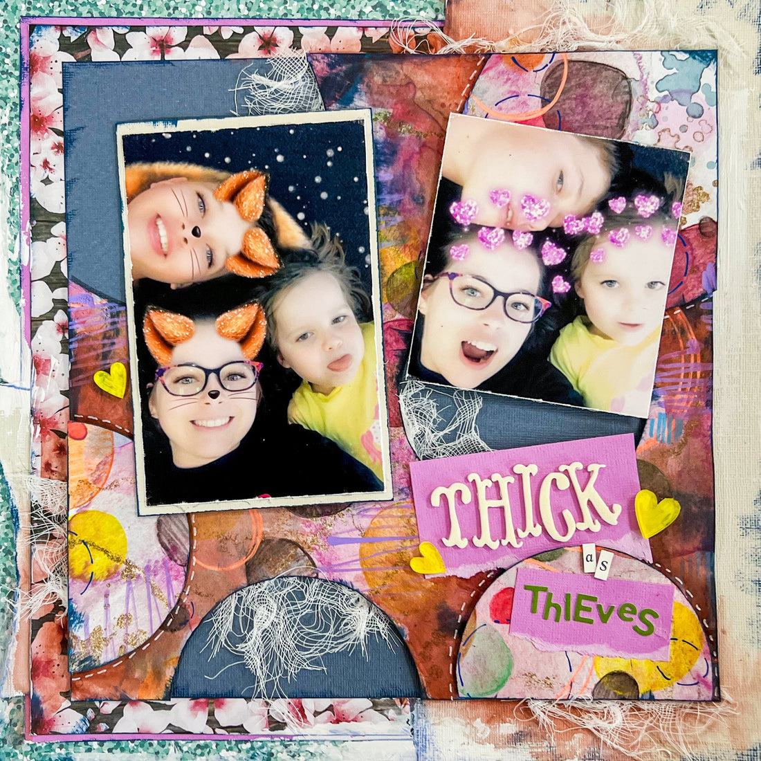 Threes are threes and in this case the scrapbook layout needed to be in threes to truly treasure the photos. Thick as Thieves does not describe this band of Redshaw children better with the three youngest doing a ritual as old as time. For when Naomi-Jon Redshaw was at school in the afternoons at the shop Amelia-Ann, Noah and Naomi-Jon would choose a piece of carpet get comfy and take a gazillion photos. Filtered, non-filtered, tongues out, grins up, bunny ears sneaky in and a few peace signs here and there while laughter spread throughout the store. This scrapbook layout may have taken Naomi-Jon more than a day and several snack breaks to create it but the result is worth it.