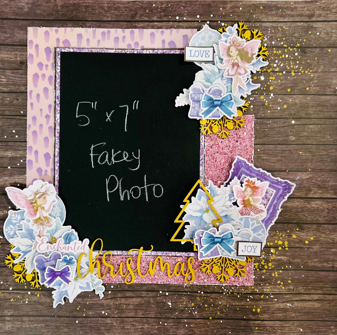 There is nothing more Scrapbook Fantasies than a live Scrap-Along where the amazing Alicia Redshaw mixed and matched multiple Christmas-related embellies with non-christmas paper collections exclusive to Scrapbook Fantasies. In this free, online class Super Funtimes and Peace & Joy papers together with Snow Princess Christmas blooming bouquets, flicks of paint with fairies bursting out and metalic-painted chipboard popping out to say, 'Hello and Merry Christmas.' These gorgeous clusters surround the feature 5x7 inch photo that can go with any of your past, present or future christmas photos .... well maybe not those delightful blurry ones.