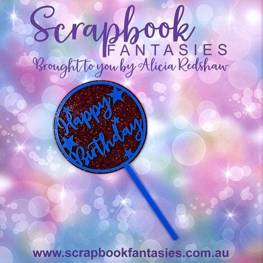 Acrylic Cake Topper - Two-Colour Happy Birthday with Stars - Blue + Red Glitter - 4"x4" 14819